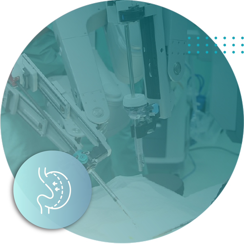 • Bypass gástrico: La cirugía robótica de bypass gástrico está orientada a pacientes con obesidad de riesgo, al reducir el tamaño del estómago así como modificar el tracto digestivo para limitar la cantidad de alimentos que puede ingerir y la cantidad de nutrientes que su cuerpo puede absorber.
